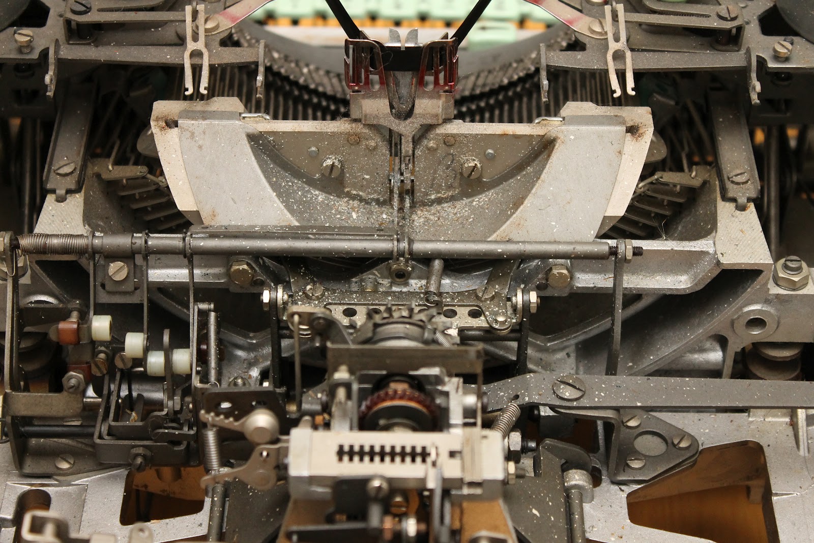 In case anyone should want to know: in this picture the tabulator brake is at the bottom of the image, left of centre (slightly out of focus). For a gentler tabulator operation move the vertical spring one or more positions to the right.