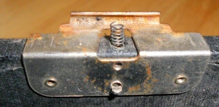 I bought a (1949?) Smith Corona Clipper. It came with the case but one of the back hinges is broken. It's missing a little screw and the mechanism that clamps the lid onto the base bar (it looks like an angular hook). (It still has the spring in place.)
